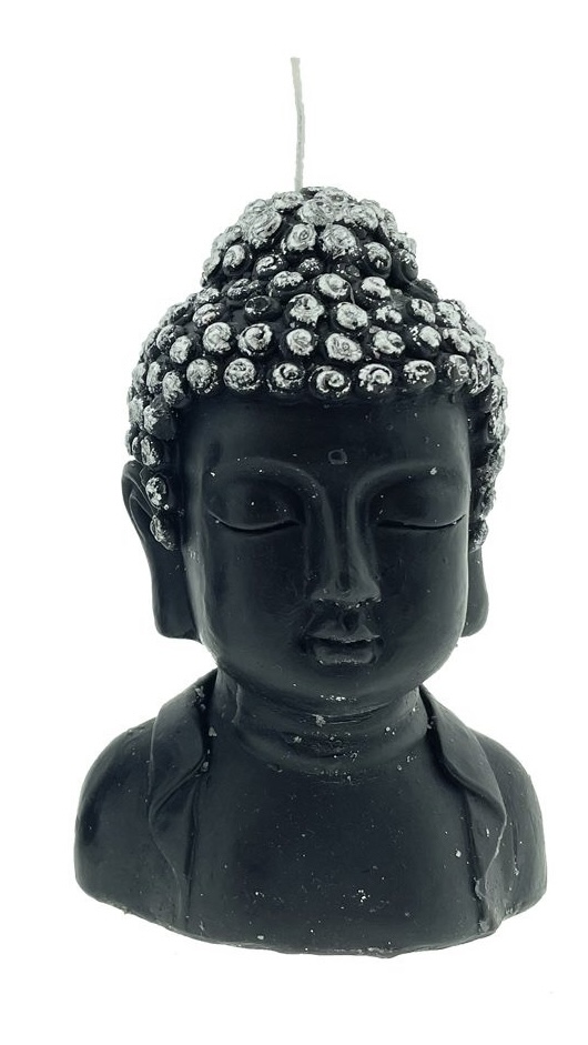 Mooie zwarte, geurloze kaars in de vorm van een Boeddha hoofd. Op het hoofd zijn de kleine rondjes zilver gemaakt. De kaars heeft ongeveer 11 branduren.