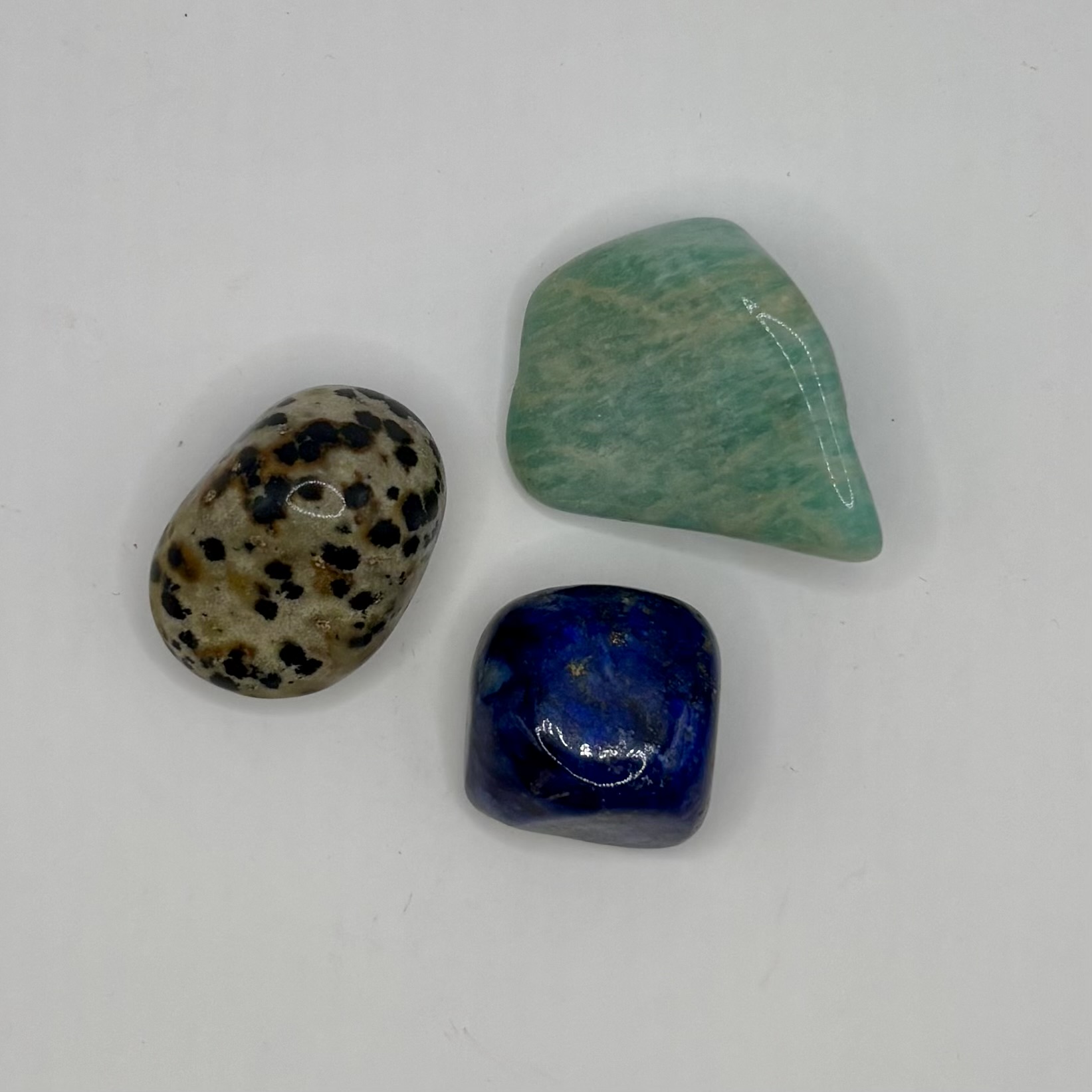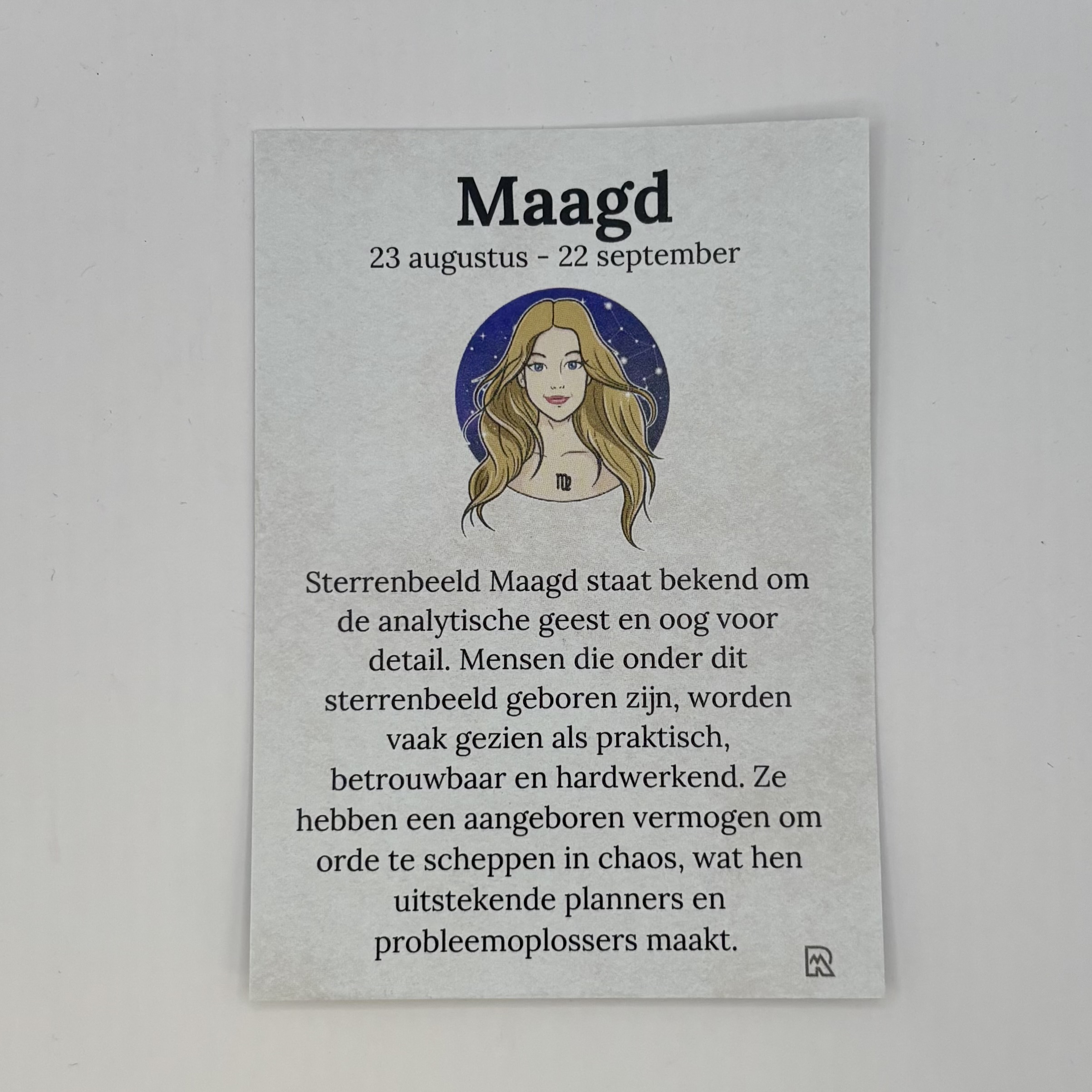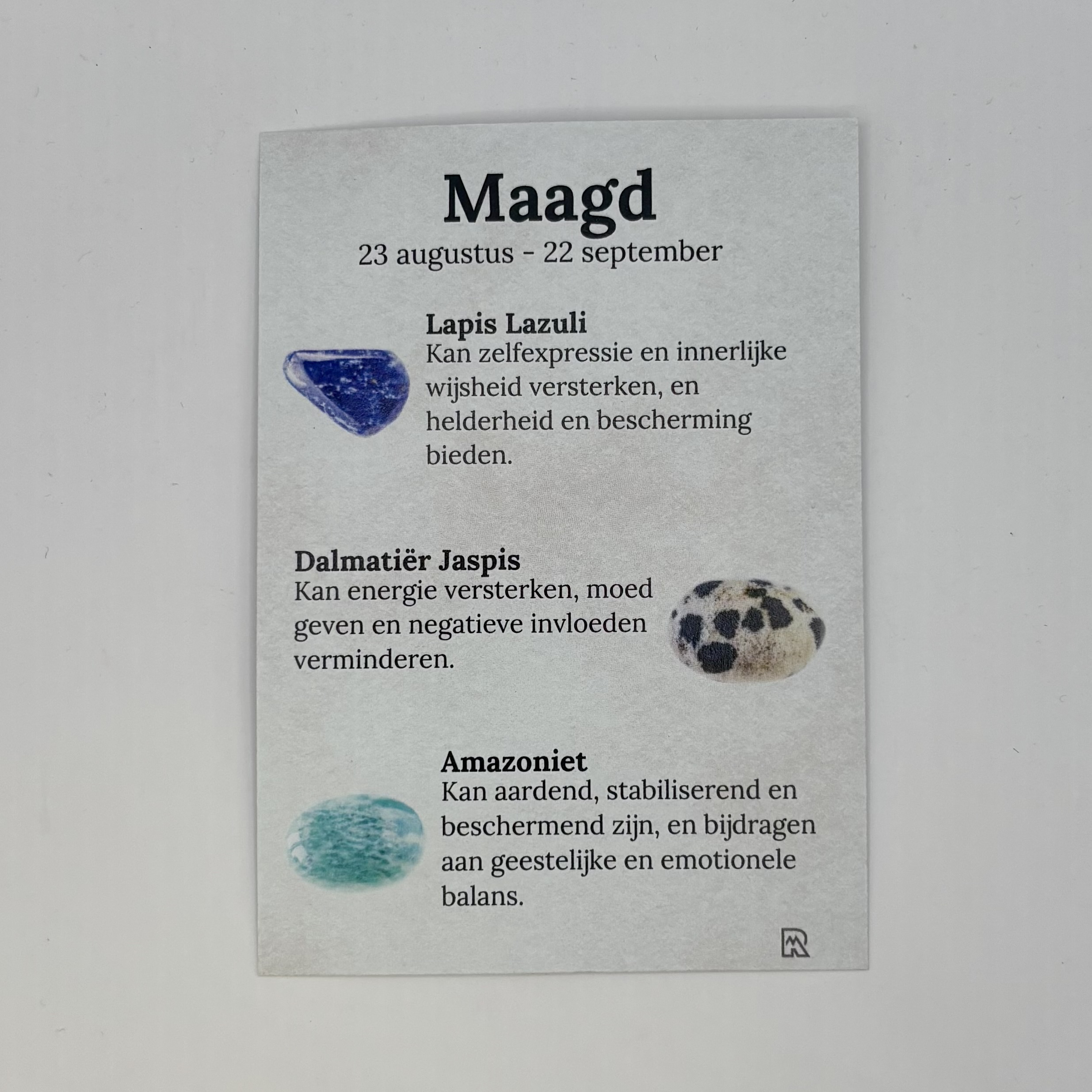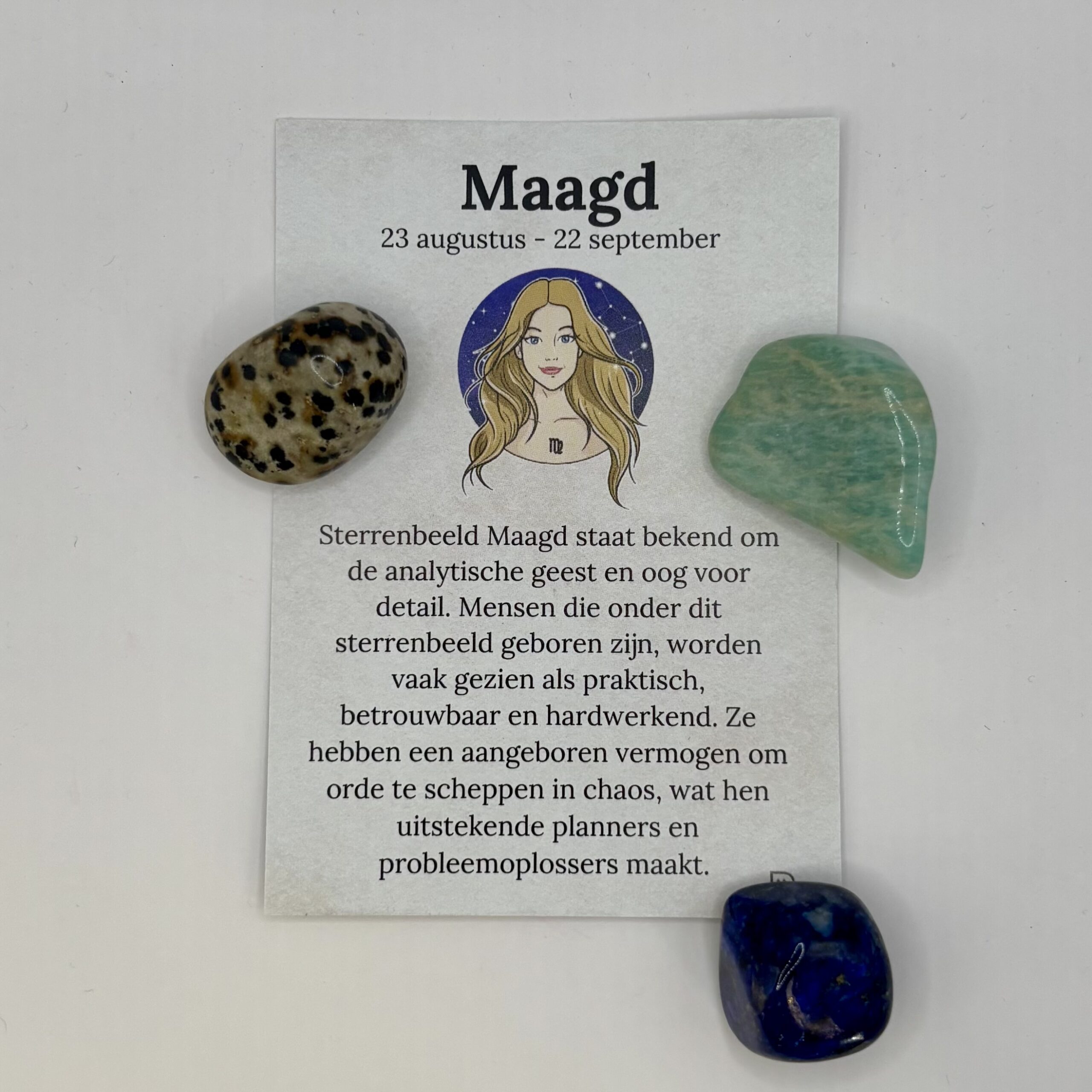 Een cadeauzakje met 3 edelsteentjes passend bij het sterrenbeeld maagd. Op de voorkant van het kaartje het sterrenbeeld maagd en op de achterkant van het kaartje de uitleg van de edelstenen Lapis Lazulli, Dalmatiër Jaspis en Amazoniet. Dit is een natuurproduct, dus de kleur en vorm kunnen variëren van de getoonde afbeelding.