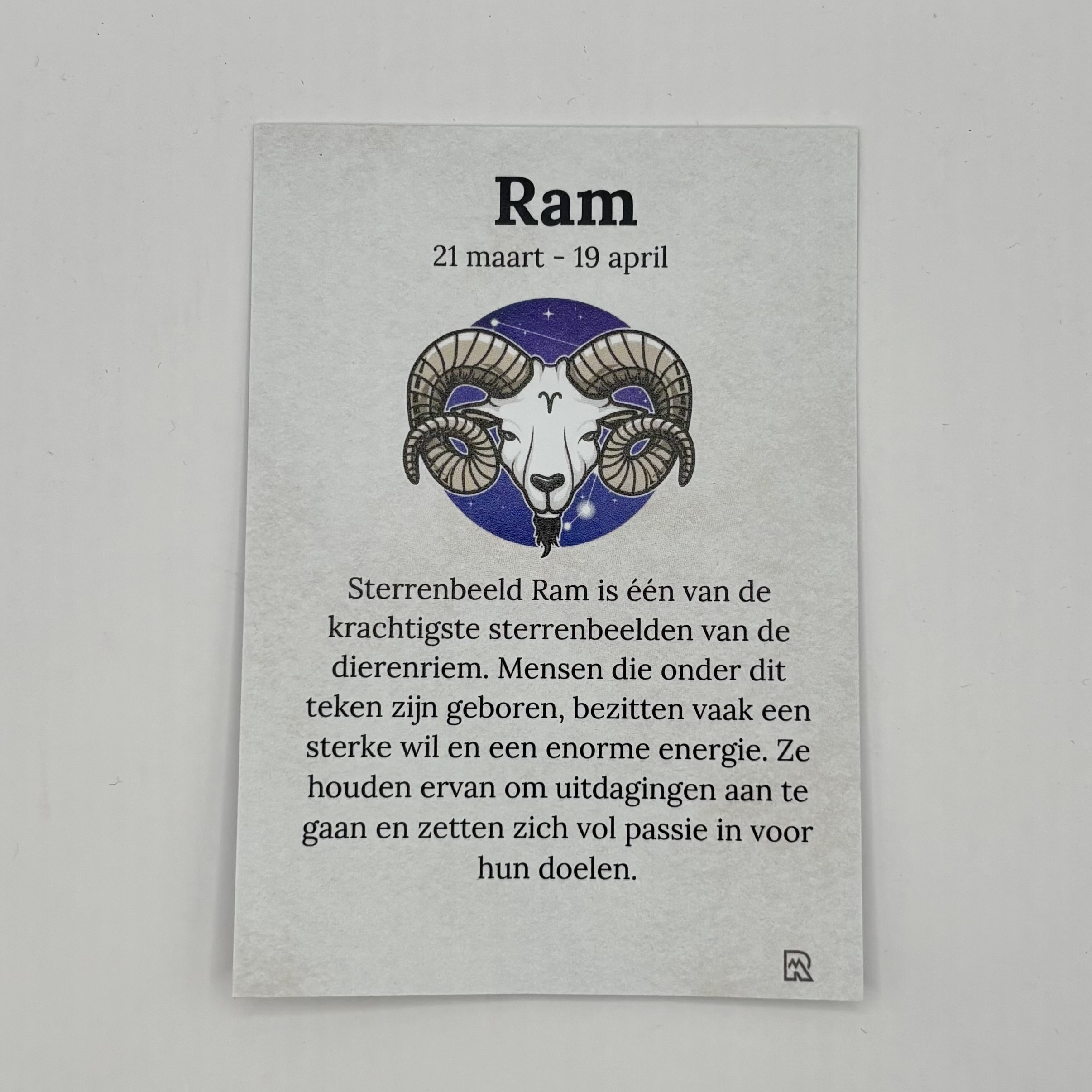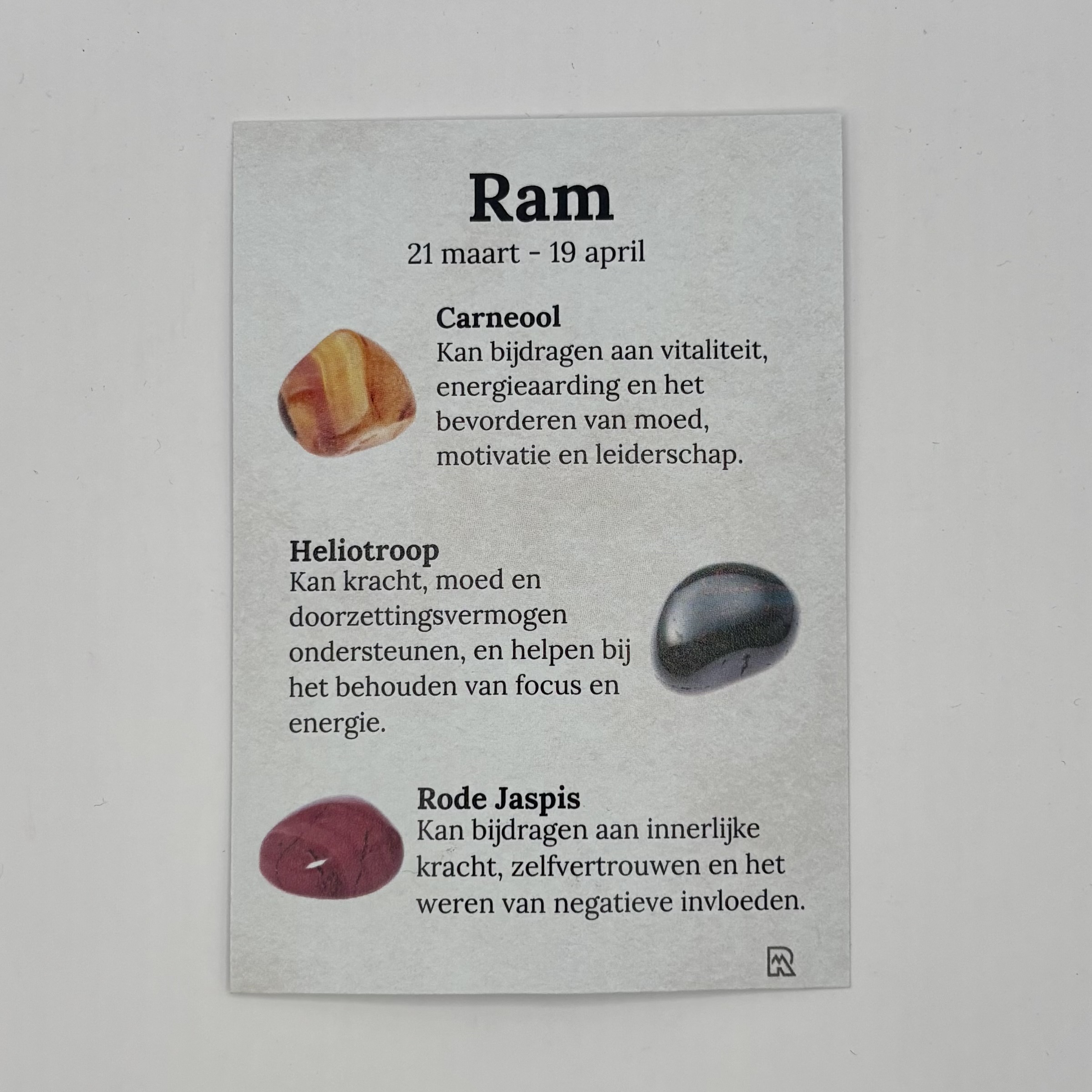 Een cadeauzakje met 3 edelsteentjes passend bij het sterrenbeeld ram. Op de voorkant van het kaartje het sterrenbeeld ram en op de achterkant van het kaartje de uitleg van de edelstenen Carneool, Heliotroop en Rode Jaspis. Dit is een natuurproduct, dus de kleur en vorm kunnen variëren van de getoonde afbeelding.