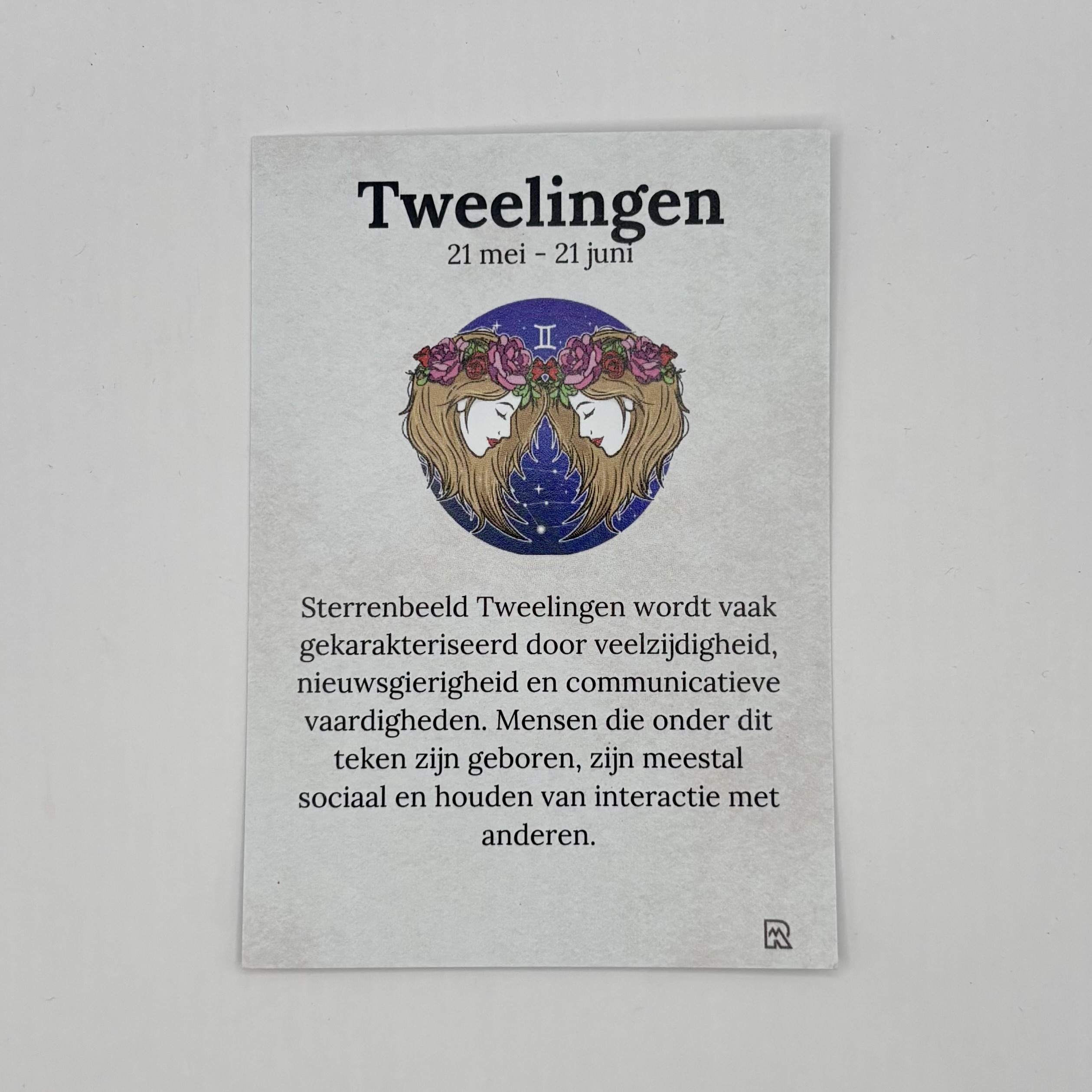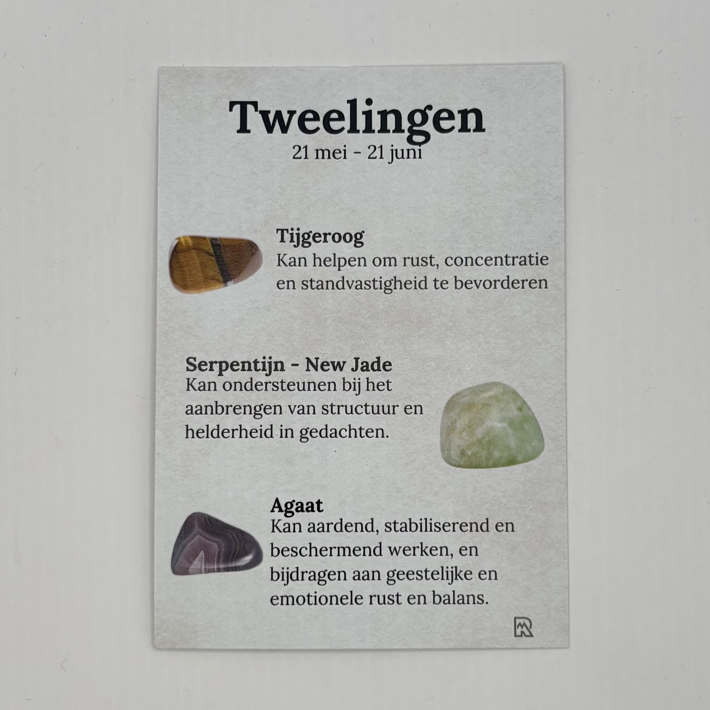 Een cadeauzakje met 3 edelsteentjes passend bij het sterrenbeeld tweelingen. Op de voorkant van het kaartje het sterrenbeeld tweelingen en op de achterkant van het kaartje de uitleg van de edelstenen Tijgeroog, Serpentijn – New Jade en Agaat. Dit is een natuurproduct, dus de kleur en vorm kunnen variëren van de getoonde afbeelding.