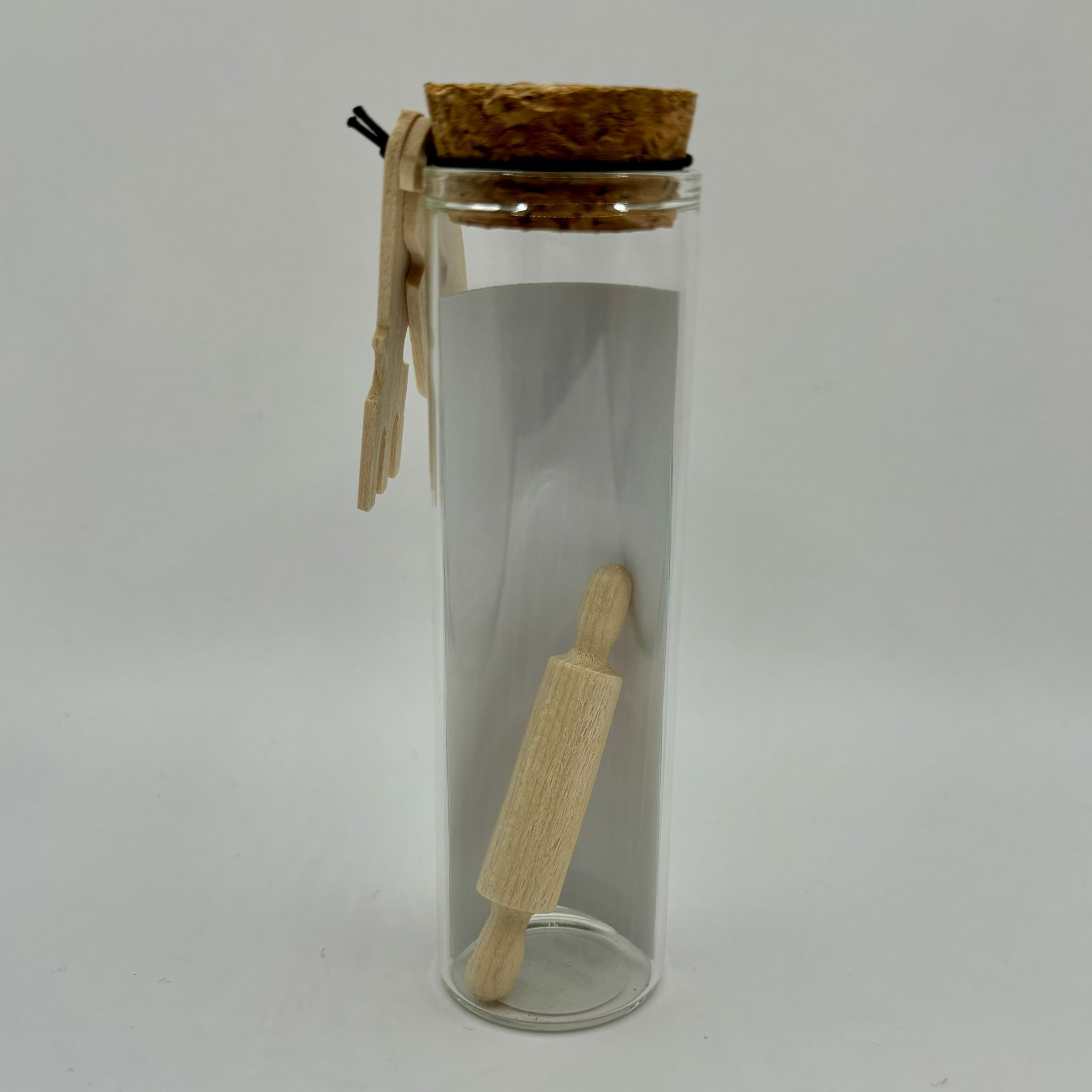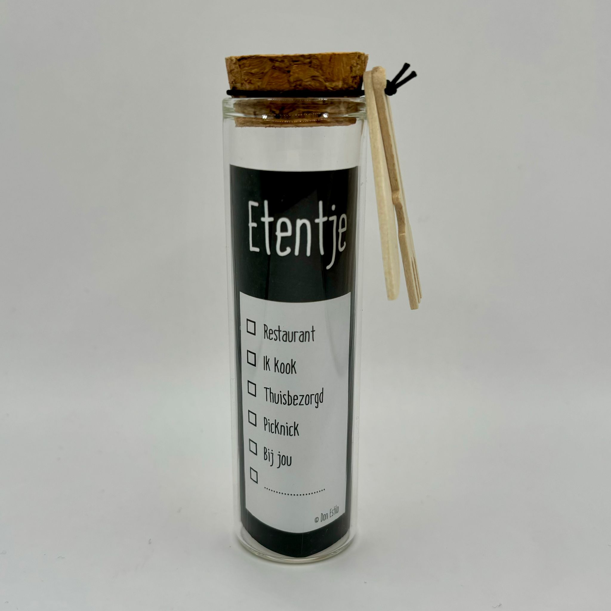 Glazen flesje met een dopje van kurk. Erin 2 houten spatels en een deegrollertje en een kaartje waarop je kan aankruisen wat voor soort etentje je cadeau wilt doen.