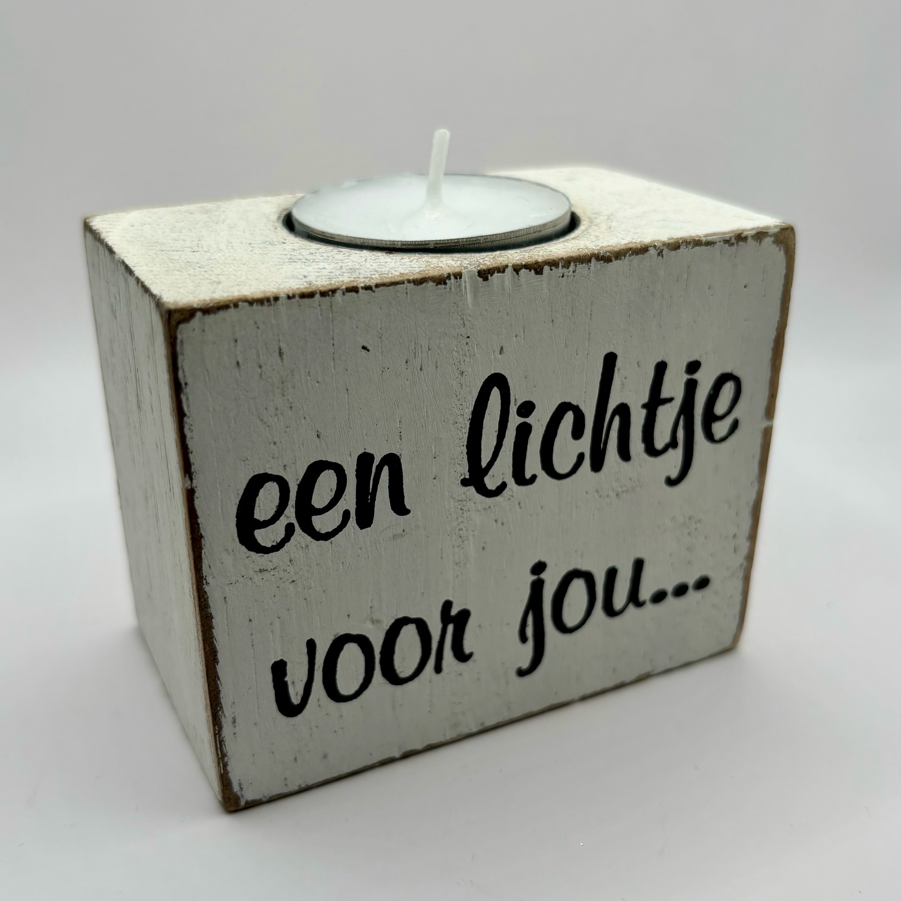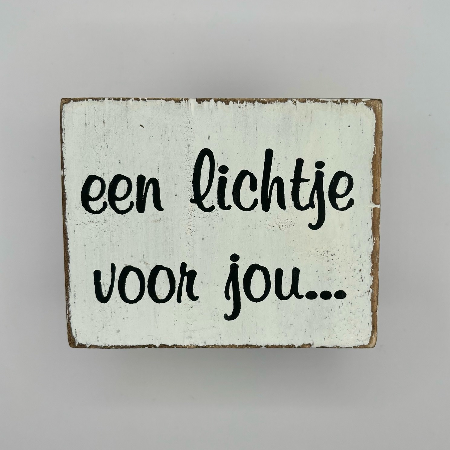 Wit houten blokje met lieve tekst “een lichtje voor jou” voor een waxinelichtje.
