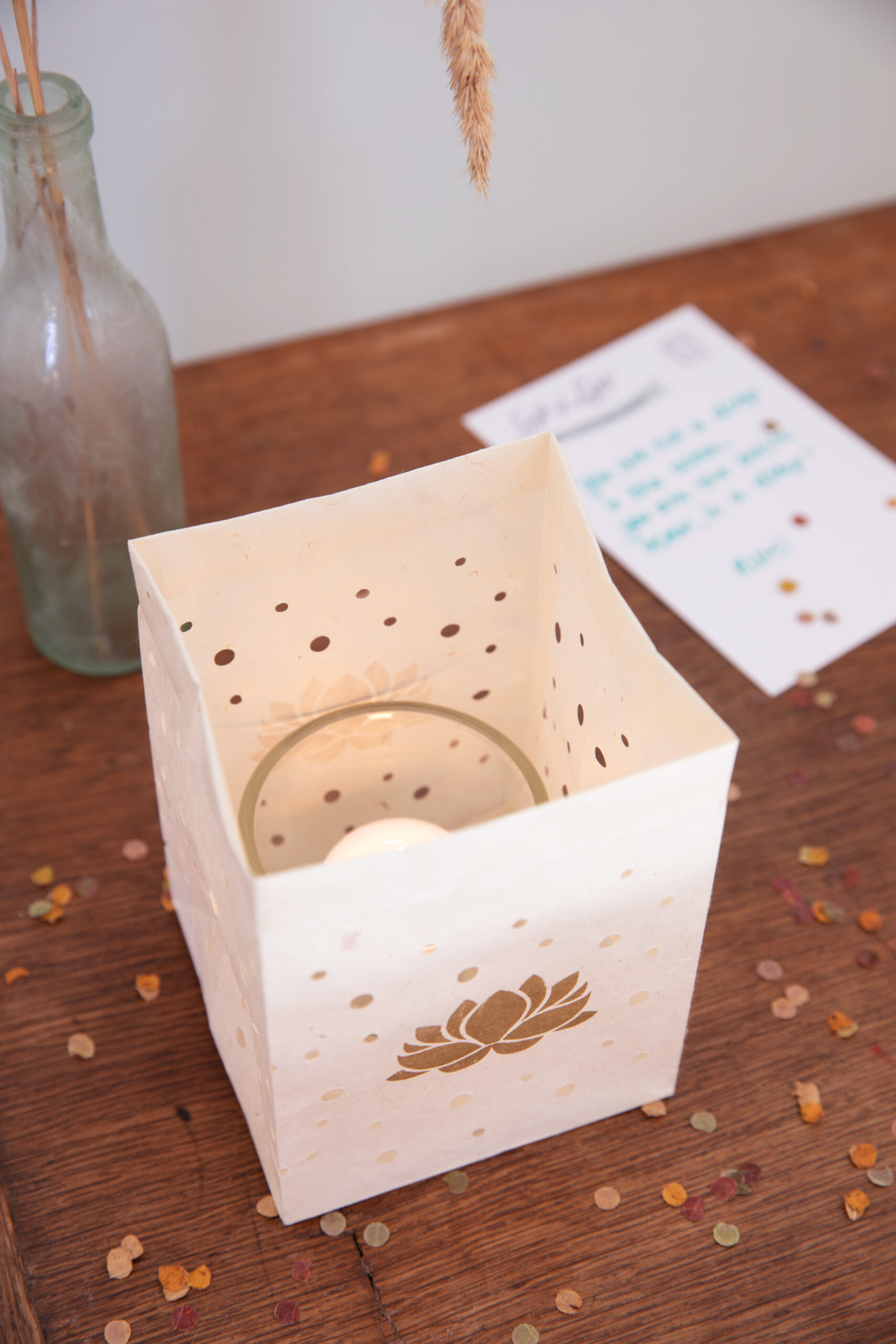 Inhoud verpakking: lichtzakje met lotus, kaart, goudkleurige envelop.