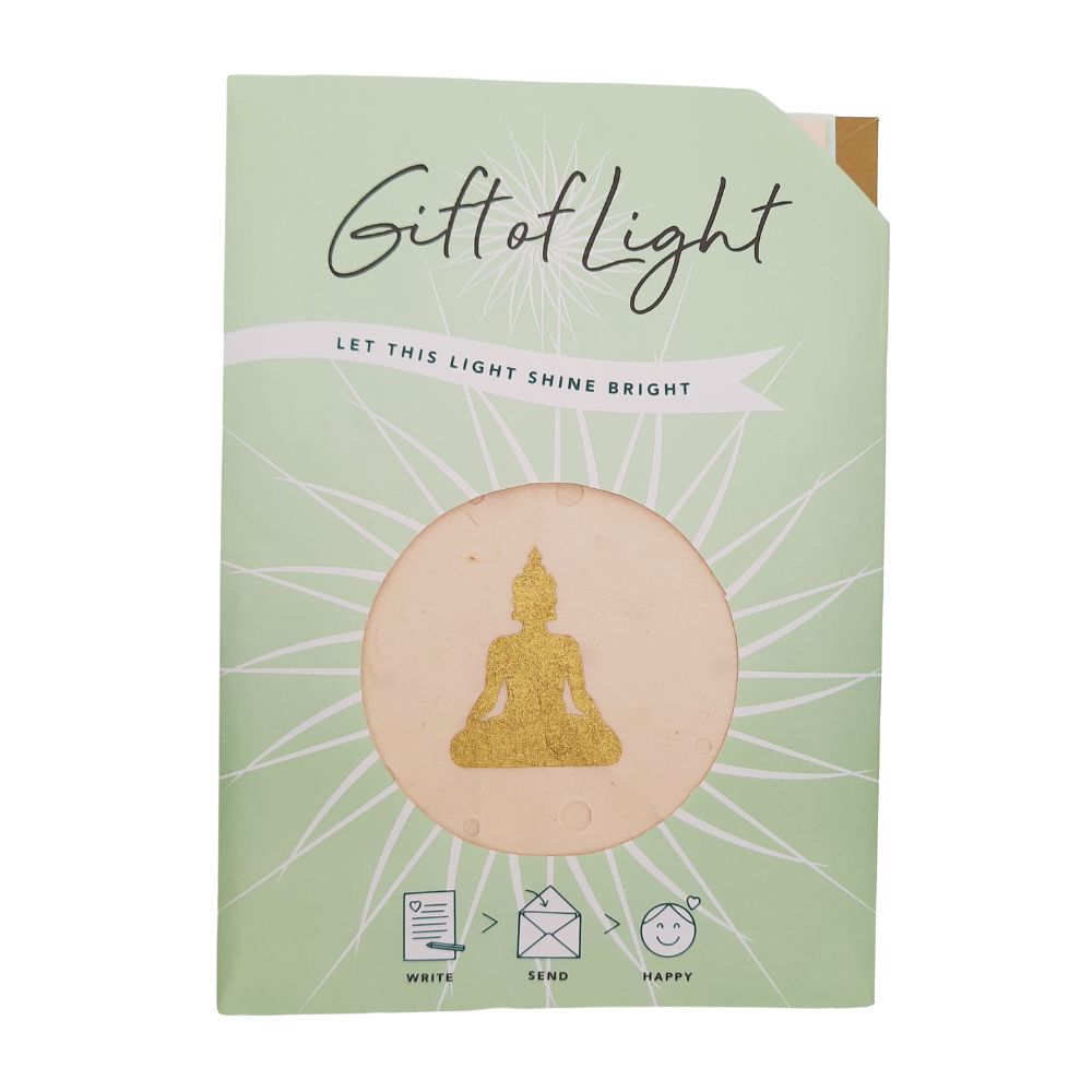 Hét brievenbuscadeautje voor iemand die je lief is. Deze Gift of Light is met passie in Nepal gemaakt van handgeschept papier en voorzien van een boedha in sprankelend goud. De Boeddha symboliseert geduld en concentratie. Het belichaamt sereniteit en leert ons innerlijke vrede te cultiveren en spirituele groei na te streven.