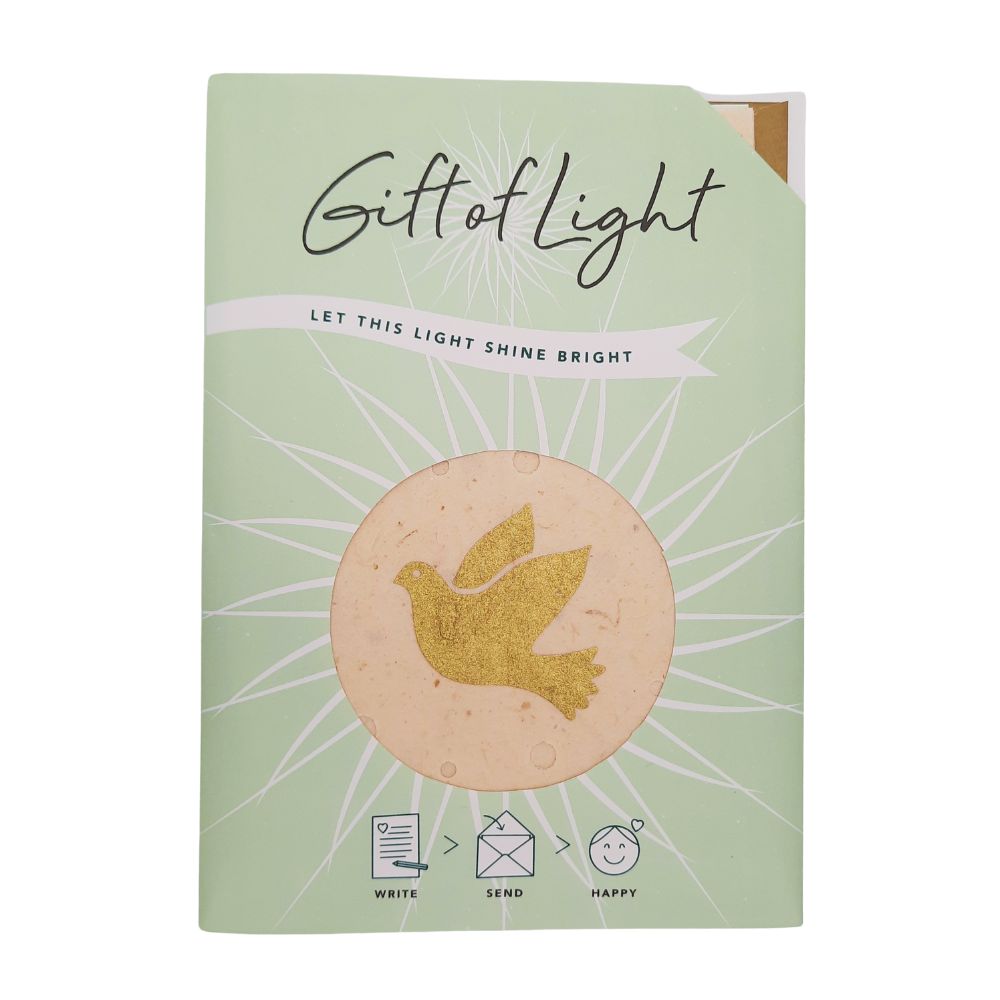 Hét brievenbuscadeautje voor iemand die je lief is. Deze Gift of Light is met passie in Nepal gemaakt van handgeschept papier en voorzien van een duif in sprankelend goud. De duif symboliseert vrede en vrijheid. Met haar sierlijke vlucht stijgt zij hoog boven aardse conflicten uit. De duif is een universeel symbool voor harmonie, liefde en bevrijding.