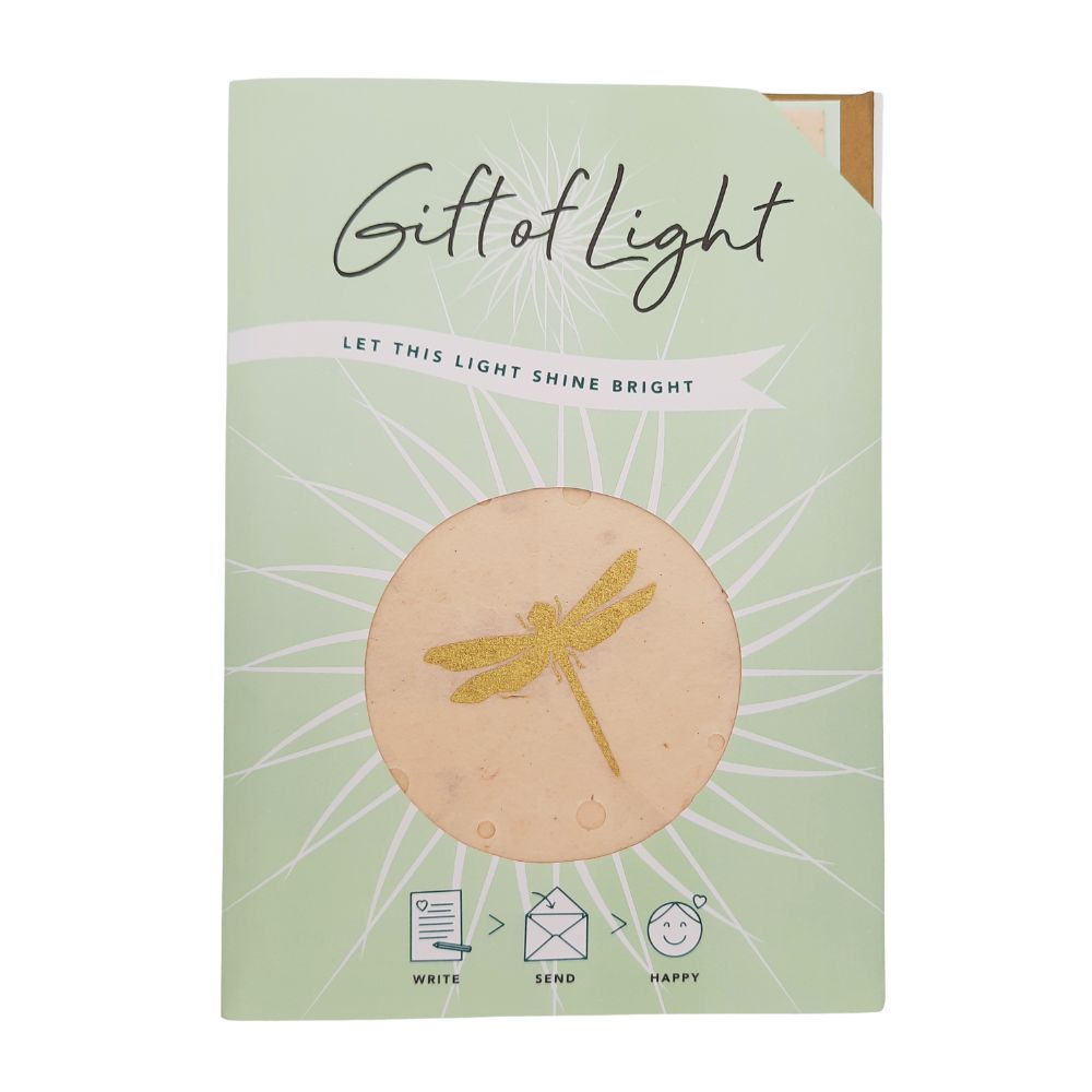 Hét brievenbuscadeautje voor iemand die je lief is. Deze Gift of Light is met passie in Nepal gemaakt van handgeschept papier en voorzien van een libelle in sprankelend goud. De libelle symboliseert verandering en geluk. Het herinnert ons eraan om flexibel te blijven en alle fasen in het leven met een licht hart te omarmen.