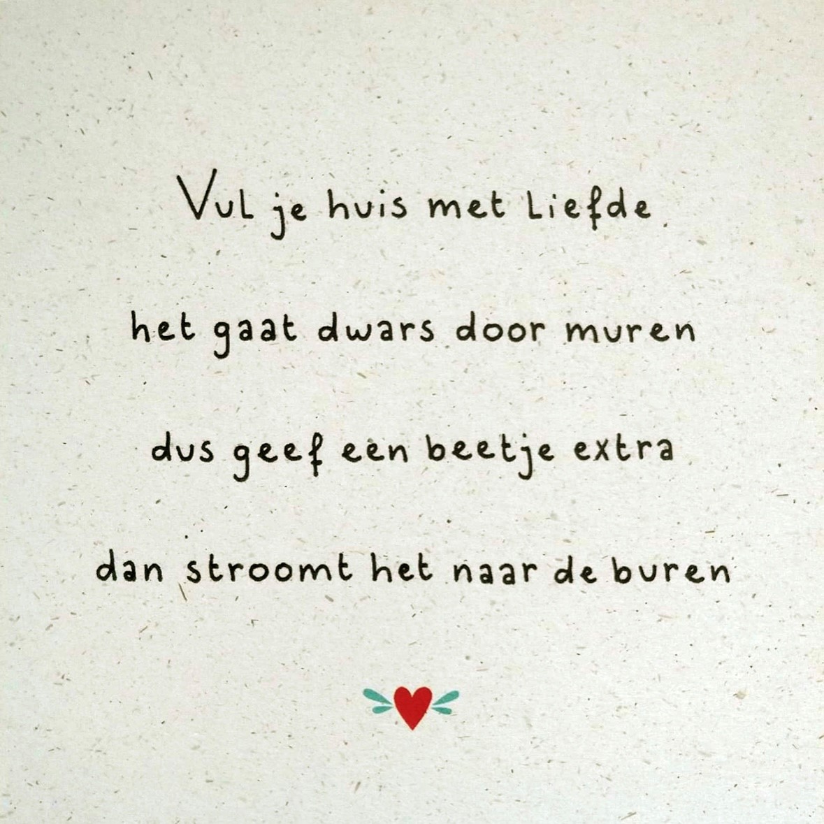 Het papier van de wenskaarten is boomvrij, gemaakt van bermgras en bedrukt met bio inkten. Bij de wenskaart ontvang je een gerecyclede wenskaart envelop.