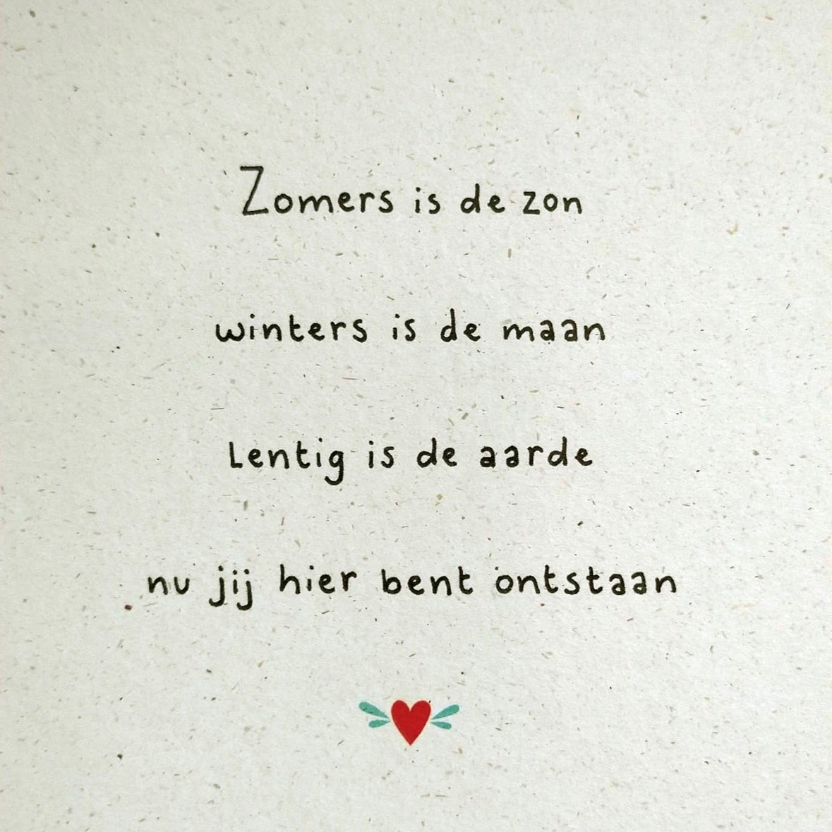 Het papier van de wenskaarten is boomvrij, gemaakt van bermgras en bedrukt met bio inkten. Bij de wenskaart ontvang je een gerecyclede wenskaart envelop.