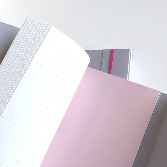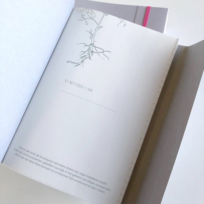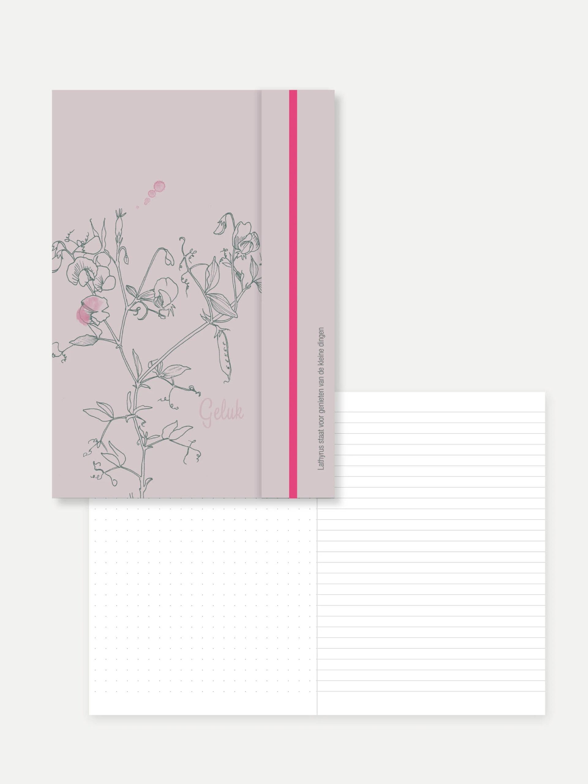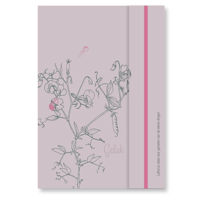 Mooi en lief geïllustreerd notitieboek A5 formaat met thema ‘geluk’. 160 pagina’s binnenwerk met aan rechterzijde lijntjes en aan linkerzijde bullets. Halverwege twee roze blanco pagina’s. Notitieboek is verkrijgbaar met 3 verschillende kleuren elastiek.