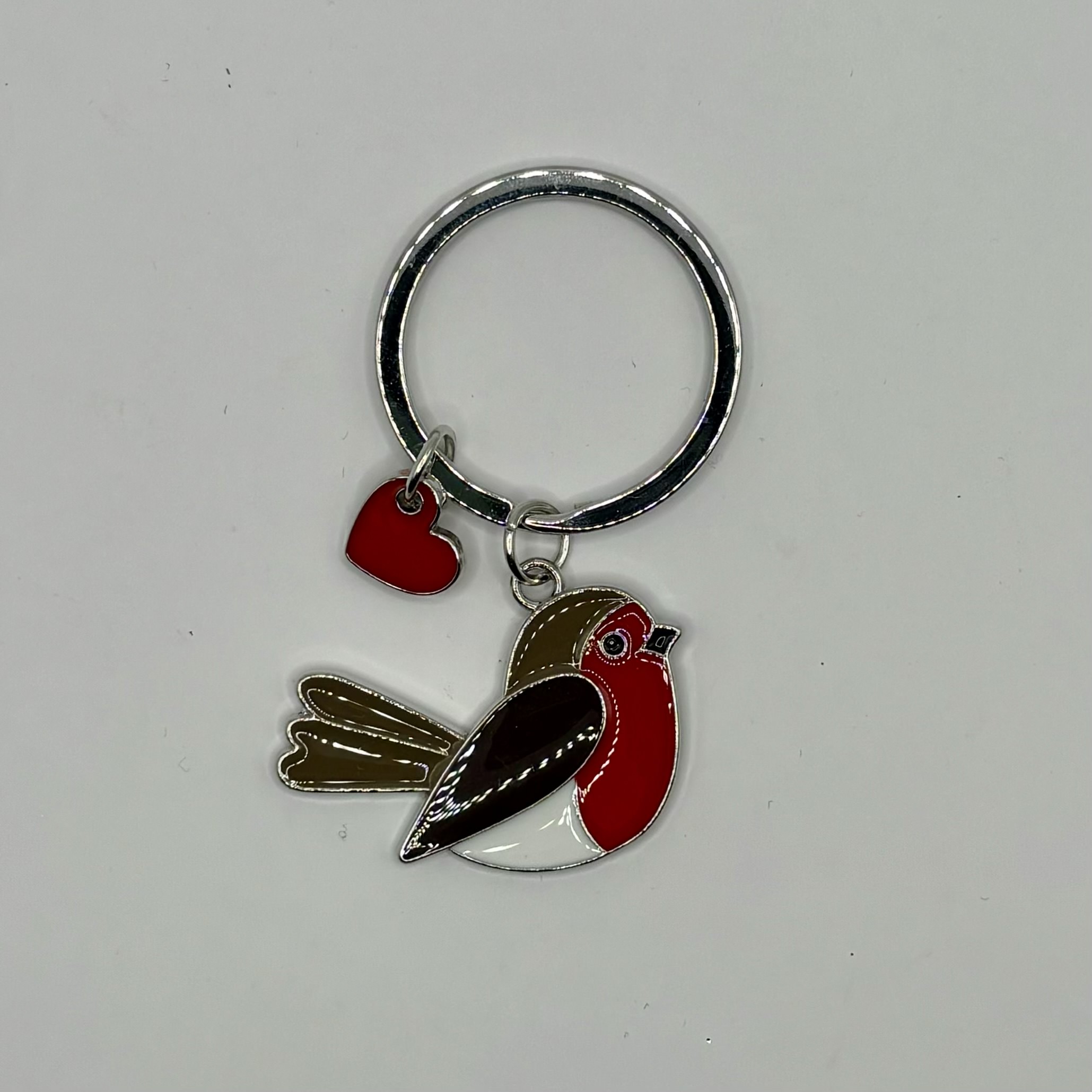 Lief roodborstje en een klein hartje aan een sleutelhanger.