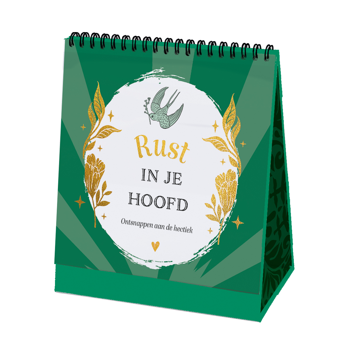 De tafelstaander is spiraal gebonden, is afgewerkt met goudfolie en zit in een stevig boxje.
