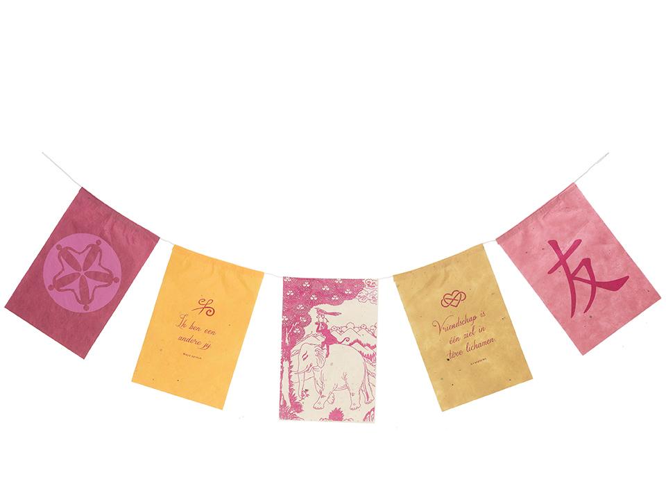 Wenskaart in de vorm van vlaggetjes, met envelop en los velletje van geschept papier voor je persoonlijke boodschap.