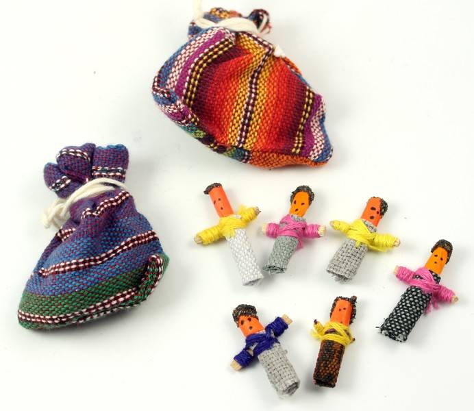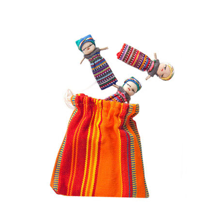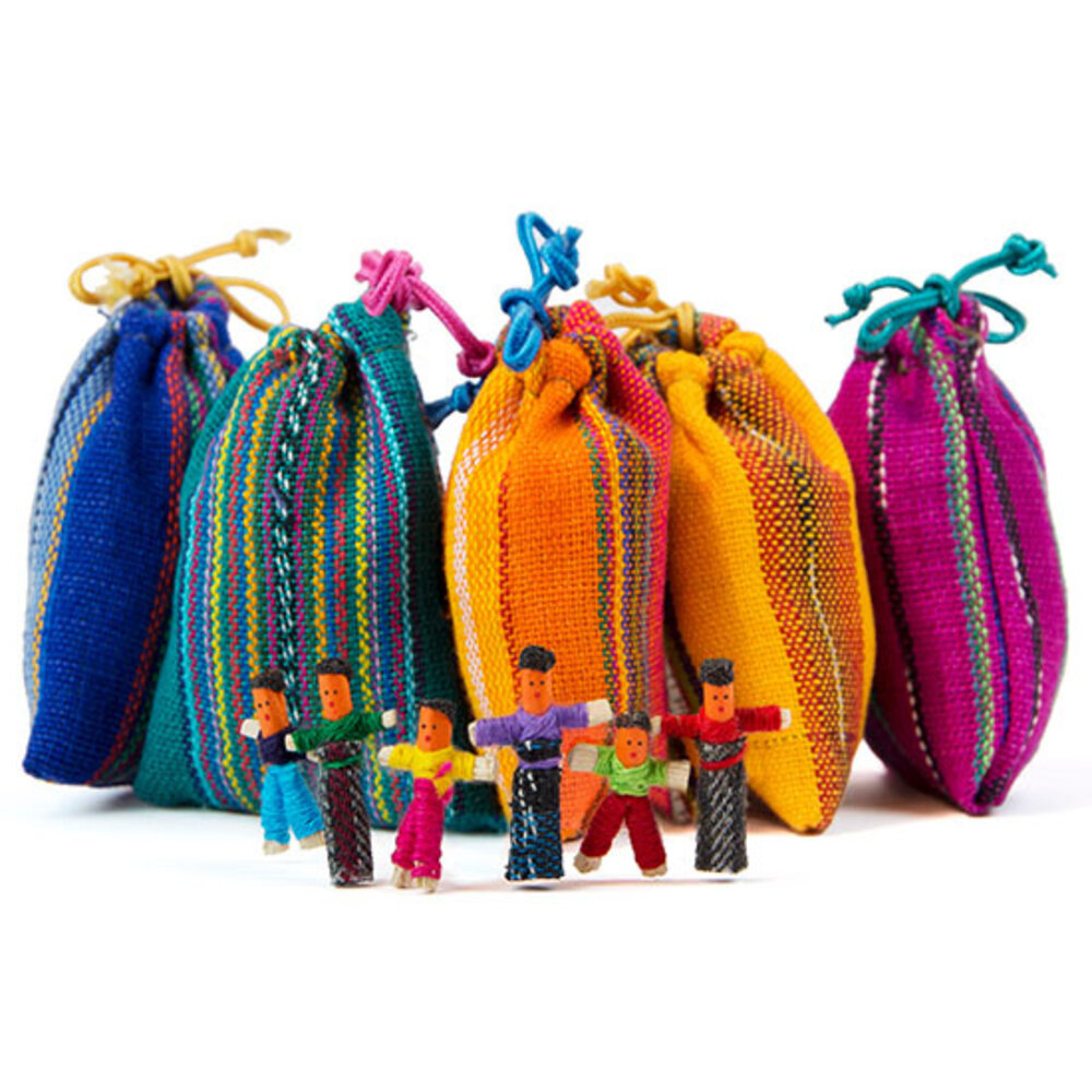Kleurrijk buideltje met 6 zorgenpoppetjes. De zorgenpoppetjes, ook wel Worry Dolls genoemd, zijn op traditionele wijze handgemaakt in Guatemala (Zuid-Amerika). Volgens de legende in Guatemala neemt het kleurrijke zorgenpoppetje zorgelijke gedachten over en geven ze rust, zodat de persoon die een poppetje onder zijn of haar kussen legt, rustig zal slapen.
